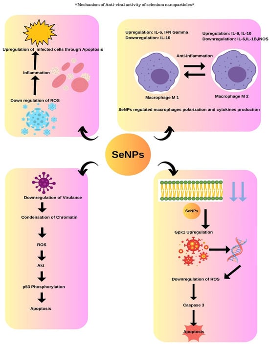 SeNPs were known to exhibit anti-viral activity through different mechanisms. SeNPs help in the downregulation of virulence by the chromatin condensation and by the release of ROS causing apoptosis/cell death. The SeNPs exhibit anti-viral activity by the upregulation of GP×1 and downregulation of caspase 3 genes that result in apoptosis (Figure 7). The Vero cells were grown on the 24-well plate where the inhibitory concentration was assessed and about 100 µL of viral suspension was incubated for 1 h and then the viral suspension was added to SeNPs at different concentrations which were incubated for 7 days after which the results were analyzed that exhibited maximum viral growth at 700 ppm; also, the anti-viral activity tended to increase with the increase in dosage as studied by the authors [50].