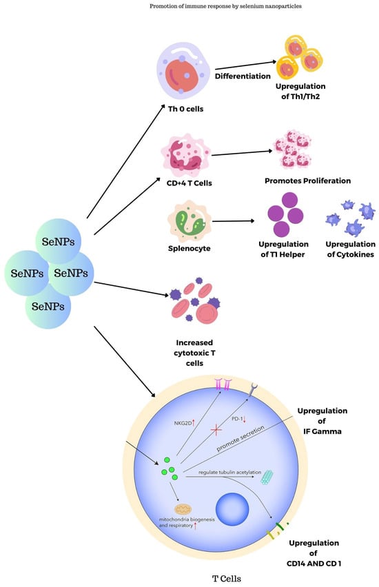 SeNPs synthesized using transmissible gastroenteritis virus were studied for their immunogenic properties in guinea pigs as reported by Staroverov et al. The blood plasma collected was investigated and the results show that they lead to the activation of respiratory and peritoneal macrophages thus leading to the production of monoclonal antibodies. In turn, they stimulate the production of interferons and cytokines and also serve as nanocarriers for viral peptides to cytotoxic T-lymphocytes [59]. Figure 9 shows the immune response promotion of SeNPs in the body. SeNPs activate the Th cells, splenocytes, CD4+ T cells, and Tc cells, thereby promoting the immune system.