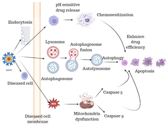 The SeNPs from the bacterial strain Bacillus sp. Msh-1 were studied for the scolicidal effect against hydatid cysts protoscoleces. Four different concentrations of SeNPs (50, 125, 250, and 500 µg/mL) were exposed to 0.5 mL of protoscoleces solution and 0.5 mL of SeNPs which were then kept at 37 °C for 10 min, 20 min, 30 min, and 60 min. After the incubation period was over, the upper portion was discarded and the protoscoleces were treated with 0.1% eosin stain which was viewed under the microscope and the dead protoscoleces were determined with normal saline as control. The results of these findings revealed that SeNPs showed potent scolicidal action at a concentration of 250 and 500 µg/mL at 10- and 20-min applications [52]. SeNPs have been known to have a pronounced scolicidal effect, where the SeNPs act on the diseased cell resulting in apoptosis by the release of ROS, lysosomes, autophagosomes, and also by the release of pH-sensitive drug release (Figure 10).
