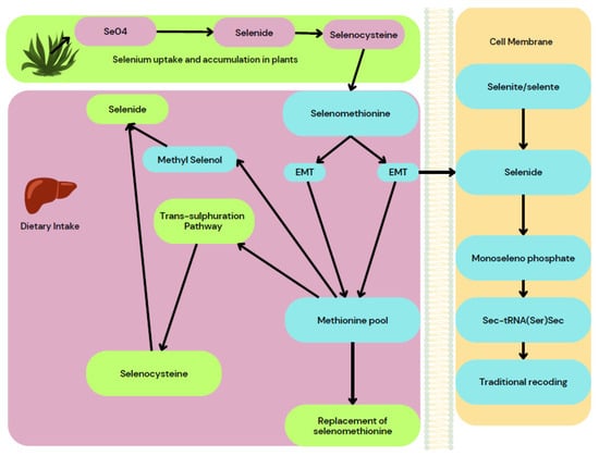 The wound size was measured and photographed and the wound-healing percentage was calculated. The results revealed that a low dose of SeNPs healed the artificial wounds in 21 days and a high dose in 18 days, whereas the antibiotic took 21 days and it took 30 days for the wound to heal in control groups. Also, rats that were treated with high doses of SeNPs showed likeness to normal skin and normal hair growth on the affected area. Thus, the authors report that SeNPs appear to be more efficient in wound healing than Lyramycin antibiotic [50]. The wound-healing property of SeNPs acts on the trans-sulphuration pathway where the selenide and selenocysteine are converted to methionine and it will result in the replacement of selenomethionine that provides necessary action on the wound-healing property of SeNPs as depicted in Figure 11.