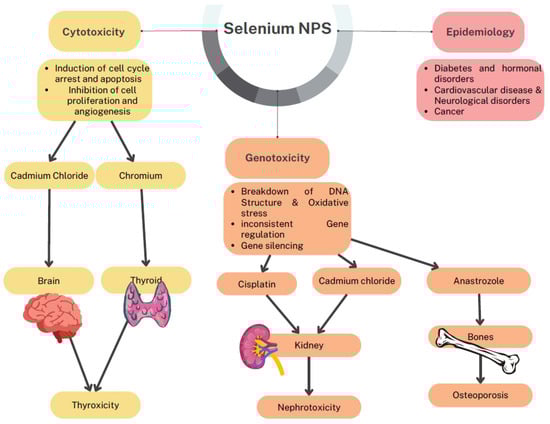 To employ the SeNPs as an effective antimicrobial as well as antibiofilm agent, Khiralla and Deep have studied the toxicity nature of their tested concentration on Artemia larvae that produced no toxicity [48]. Figure 12 relates the different toxicity of SeNPs such as cytotoxicity, genotoxicity, and epidemiology. SeNPs have cytotoxic effects on the induction of cell cycle arrest and apoptosis. It also pronounces that effect on cell proliferation and angiogenesis. Genotoxicity of SeNPs results in the breakdown of DNA structure and oxidative stress; gene silencing and gene regulation are the important parameters of genotoxicity. SeNPs toxicity on different organs such as the thyroid is known as thyrotoxicity; in the kidney, it is known as nephrotoxicity, and when it affects bones, it results in osteoporosis. Acute toxicity of Se and SeNPs on P. hypophthalmus was analyzed at different concentrations where they confirmed from their study that SeNPs were found to be more toxic than Se at a 96 h treatment at a low dose of 3.97 mg/L. Also, the measurement of antioxidative stress indicated oxidative stress levels raised in organs like the gill, liver, and brain at an increased concentration of Se 4.5–6.0 mg/L and SeNPs at 2.5–4.0 mg/L. This indicated the toxic level of Se and SeNPs that could lead to the production of ROS due to their bio-accumulation in the organs. The neurotransmitter enzymes detected in terms of AChE activities in the liver, brain, and muscle were pointedly inhibited in Se and SeNPs. The levels of protein enzymes like AST, ALT, and carbohydrate metabolic enzymes like LDH and MDH activities with cortisol and HSP 70 of Se and SeNPs were significantly elevated. The histopathology study report of the liver and gill of P. hypophthalmus showed several deformities on introduction to Se and SeNPs. Thus, they determined that the toxicity of Se and SeNPs purely depends on the concentration and the quantity. It was found to be toxic at a higher concentration; also, SeNPs were reported to be more toxic than Se. Therefore, a low dose of Se is recommended as it is a vital micronutrient for humans and animals [49].