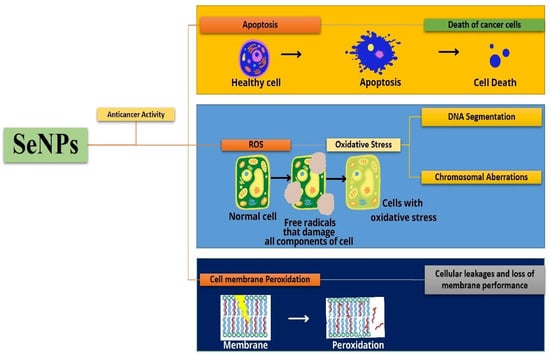 The mechanism of apoptosis and cell membrane peroxidation using SeNPs on the cancer cells is shown in Figure 13. The SeNPs cause apoptosis of the cancer cells leading to cell death. Another means of killing cancer cells is the release of reactive oxygen species that damage the components of the cell utilizing the release of free radicals. Cells will develop oxidative stress that results in DNA fragmentation and chromosomal aberrations. Peroxidation of cell membranes leads to membrane cleavage that leads to cellular leakage and loss of membrane performance. Huang et al. have synthesized Tf-SeNPs to investigate the cellular uptake of doxorubicin in cancer cells and they found that dox-loaded Tf-SeNPs exhibited cytotoxicity on MCF-7 cancer cell lines. The synthesized Tf-SeNPs activate ROS production, promoting apoptotic cell death. They also analyzed the activity of Tf-SeNPs, by inducing in vivo tumor development in a mice model. It was reported that they reduce tumor growth by the induction of p53-mediated apoptosis. Thus, these SeNPs are effective in treating cancer with efficacy and lesser side effects [24]. The SeNPs synthesized from the spirulina polysaccharides with a particle size of 48.6 nm were employed for the study on MCF-7, A375, MG-63, and HeLa-229 cancer cells. The in vitro anticancer analysis on the cancer cells exhibited a very low cytotoxic effect on the MCF-7, HeLa-229, and MG-63 cancer cells, whereas 50% cytotoxicity was observed for the A375 melanoma cancer cells. The mechanism behind the induction of apoptosis in these cells was studied through flow cytometry and DAPI staining. Thus, this study shows that SeNPs act as an effective anticancer drug against human cancer [46].