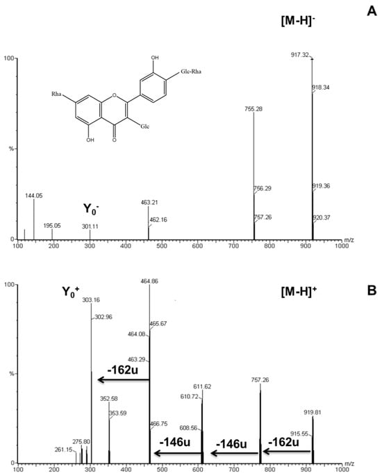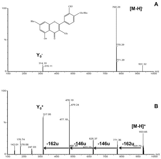 ESI spectra of isorhamnetin tetraglycoside in negative (A) and positive (B) mode.