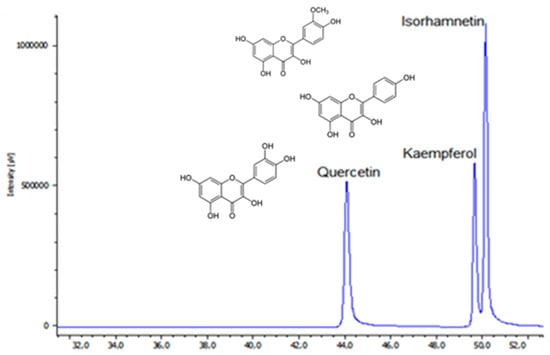 The acid hydrolysis of the extracts resulted in the isolation of three different flavonols. Figure 3 illustrates that among these flavonol aglycones, isorhamnetin was the most prominent compound found in the extracts from A. stipularis. This finding is significant as it distinguishes A. stipularis from many other Asparagus species, both wild and cultivated, where quercetin glycosides, primarily rutin, are the predominant components and, in some cases, the sole flavonoids present in asparagus tissues [22,23]. The presence of isorhamnetin as the primary aglycone in A. stipularis indicates a unique flavonoid profile for this species, which can have implications for its potential uses and medicinal properties. This distinction underscores the importance of studying the chemical composition of different plant species to better understand their potential benefits and applications.