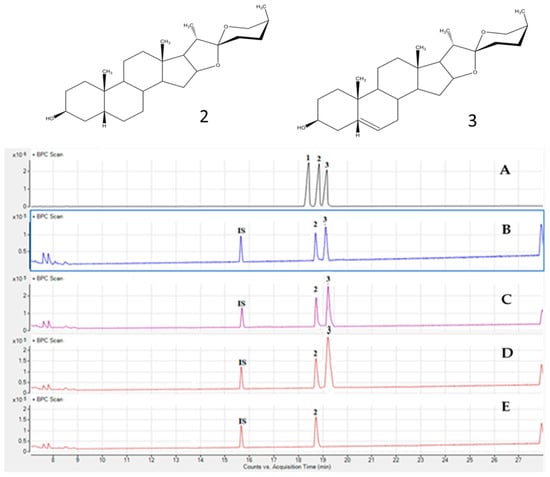 Chromatographic profile acquired by GC-MS of standards (A), stem (B), leaf (C), pericarp (D), and rhizome (E) of hydrolyzate crude saponins of A. stipularis and its sapogenins detected: 1: smilagenin, 2: sarsasapogenin, 3: diosgenin, IS: inter-standard (cholesterol).