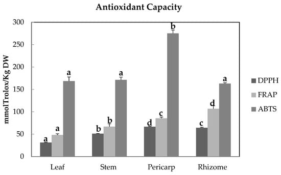 Antioxidant activities, expressed as mmolTrolox/Kg of dry weight in A. stipularis leaf, stem, pericarp, and rhizome ethanolic extracts, determined by DPPH, FRAP, and ABTS assays. DPPH: DPPH radical scavenging activity; FRAP: ferric reducing antioxidant power; ABTS: ABTS radical scavenging activity. Results correspond to the mean ± standard deviation of three replicates. Different letter(s) indicate the values are significantly different (p < 0.05). The comparison is for different samples with the same method.