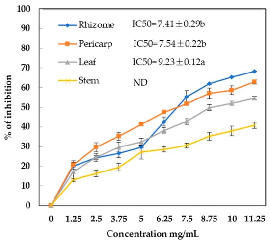 Pancreatic lipase inhibitory activity, expressed as IC50 (mg/mL) in leaf, pericarp, rhizome, and stem ethanolic extracts of A. stipularis. Results correspond to the mean ± standard deviation of three replicates. Different letter(s) indicate that the values are significantly different (p < 0.05). The comparison is for different samples with the same method. ND: not determined.