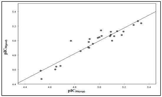 The PRESS/SSY ratio can be used to determine estimated confidence intervals for a novel compound’s forecast. This ratio is 0.11, which is less than 0.4, and this confirms that we have a good prediction model [20]. In addition, high values of R2cv and R2adj (equal to 0.89 and 0.817, respectively) and a low value of SPRESS of 0.09 are the best criteria for qualifying the QSAR model.