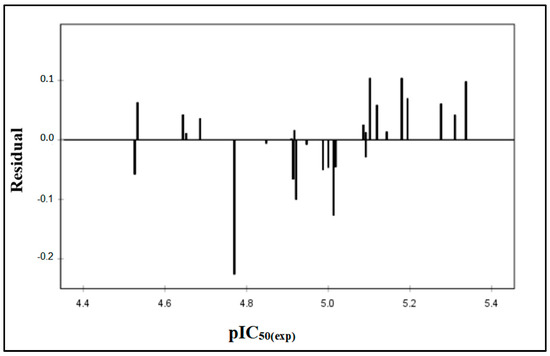 The value of residuals pIC50 against the experimental values of the biological activity does not show any systematic error (Figure 2 and Table 2). The distribution of residuals symmetrically around zero implies the absence of systematic error, corroborating the observation made by Jalali-Heravi and Kyani [22]. Thus, the current status of the QSAR investigation indicates the effective applicability of this model in predicting the activity of novel anti-PTP1B compounds within the range of 5-(benzylidene) thiazolidine-2,4-dione derivatives.