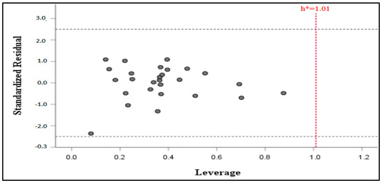 QSAR models have been established using a limited set of compounds that does not encompass the entirety of chemical space. The domain of applicability (DA) delineates the specific region within the chemical space where the QSAR model can accurately predict new compounds. Therefore, assessing the DA is crucial to ensure the dependable utilization of QSAR models [1]. Building the model applicability domain involves plotting the leverages of each compound against their respective standardized residuals. The diagonals of the hat matrix, produce the leverages for each of the compounds [46], where X is the descriptor matrix and XT is the transpose of X. The domain has warning leverage, h∗ = 2.5(K + 1)/n, where k and n represent the numbers of the training set and model descriptors, respectively. Compounds beyond the warning leverage are chemically different from the training set compounds and are considered outliers and not reliably predicted by the model [47,48].