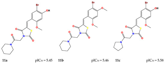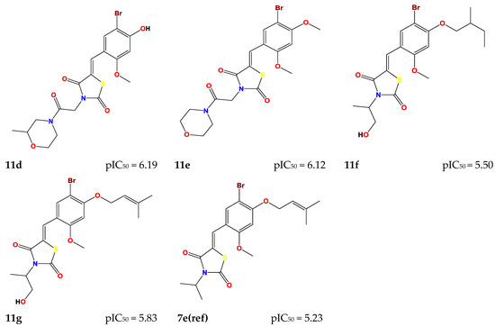 These seven compounds (11a–g) showed a higher pIC50 compared to the molecules of the series, especially compound 7e(ref), which was the most active compound (pIC50 = 5.337). The chemical structures of designed compounds and their predicted pIC50 values are shown in Figure 4.