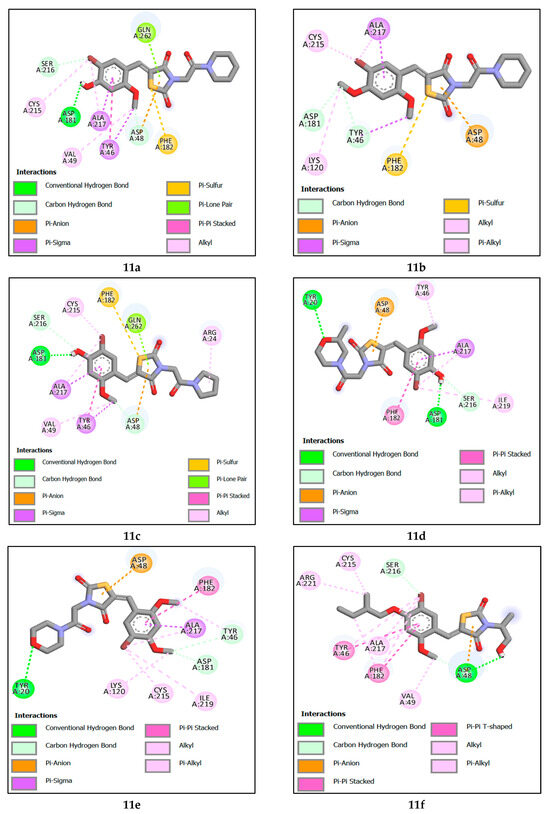 Compound 11c attained the highest binding energy by participating in various interactions with the protein. Specifically, it formed a hydrogen bond with ASP181, involving the hydrogen of the alcohol attached to the benzene ring at a distance of 1.81 Å. It also established two carbon-hydrogen bonds with ASP48 and SER216, at distances of 3.59 Å and 3.40 Å, respectively. Additionally, electrostatic interactions took place with ASP48, and pi-sigma interactions occurred with TYR46 and ALA217. Furthermore, there were alkyl-type hydrophobic interactions involving ALA217, CYS215, VAL49, and ARG24, in addition to a pi–pi stacking bond with TYR46. The second-best recorded compound was 11a, where a noticeable similarity was observed between it and compound 11c in all interactions, except for the absence of the alkyl bond with ARG24 residues, and differences in the lengths of formed bonds, ranking compound 11b as the third-best interacting compound with a protein. Notably, it formed two carbon–hydrogen bonds with TYR46 and ASP48, at distances of 2.88 Å and 2.98 Å, respectively. Furthermore, a pi-sigma interaction with ALA217 was observed, alongside an electrostatic interaction with ASP48. This was accompanied by hydrophobic interactions of the alkyl type and Pi–alkyl interactions with residues ALA217, CYS215, and LYS120, in addition to a Pi–sulfur bond with PHE182. Next is compound 11d. This compound distinguished itself by forming two hydrogen bonds, one with ASP181 and another with TYR20 at distances of 1.81 Å and 3.14 Å, respectively. Additionally, it established a carbon–hydrogen bond with the amino acid SER216 at a distance of 3.70 Å. An electrostatic interaction with ASP48 was also observed, along with a pi–sigma interaction with ALA217. It also engaged in alkyl-type and Pi–alkyl interactions with amino acids ALA217, ILE219, and TYR46, as well as a pi–pi stacking interaction with PHE182.