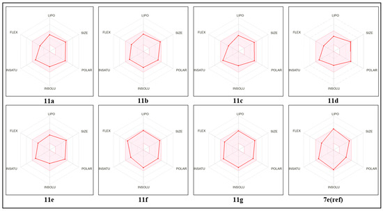 Bioavailability radar for proposed molecules and a reference compound, depicting the FLEX (rotatable bond flexibility), LIPO (lipophilicity), SIZE (molecular weight), POLAR (polarity), INSOLU (insolubility), and INSATU (insaturation) parameters.