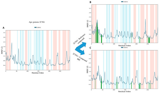 The analysis of root mean square fluctuation (RMSF) provides valuable insights into the dynamic behavior of amino acid residues within drug–target complexes [31]. High RMSF values typically indicate increased flexibility in amino acids, while low values suggest stability in specific receptor regions. In our study, as depicted in Figure 10, RMSF curves revealed that the majority of amino acid residues in the drug–target complexes exhibited slight fluctuations, generally remaining below 2.4 Ǻ. This finding suggests noteworthy stability in these residues, emphasizing the overall structural integrity of the protein within the complex. When compared to the RMSF of the apo-protein, this observation gains significance. The relatively low RMSF values indicate that the introduction of these active components (compound 11c and the co-crystallized compound) does not induce disruptive fluctuations in amino acid residues.