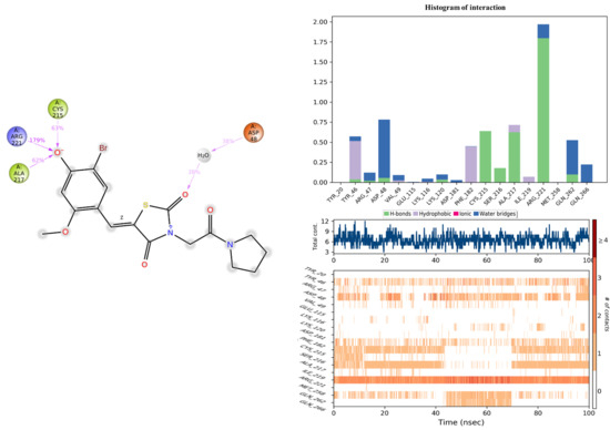 Molecular docking revealed that the reference compound 7e(ref) formed a hydrogen bond TYR46 with the bromine attached to the benzene ring at a distance of 3.16 Å, Additionally, it formed a carbon hydrogen and electrostatic bond with the thiazolidine ring and ASP48, with distances of 3.17 Å and 3.03 Å, respectively, and alkyl and π-alkyl bondsALA217, CYS215, VAL49, and ARG221.