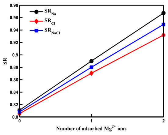 In the above equation, NNa(Cl) and NNaCl represent the initial numbers of Na+ (Cl−) ions and total salt ions (the sum of Na+ ions and Cl− ions) in the saltwater side at t = 0 while nNa(Cl) and nNaCl denote the numbers of Na+ (Cl−) ions and total salt ions that have passed through the pore at t = t1/2 (defined as the time when half of the water molecules in the saltwater side have transported through the pore [10]). Figure 1 illustrates the salt rejection rates of the GO membrane with pores adsorbed by zero, one, and two Mg2+ ions. Notably, in the absence of the Mg2+ ion, the salt rejection rate is statistically equal to the Cl− ion salt rejection rate. However, in the presence of Mg2+ cation, the Na+ rejection rate exceeds the Cl− rejection rate. This difference arises primarily from the repulsion of Na+ ions from the divalent cations. The discrepancy between the two salt rejection rates becomes more pronounced as the number of adsorbed Mg2+ ions increases. Both the Cl− ion salt rejection rate and the Na+ ion salt rejection rate increase when more Mg2+ ions are adsorbed by carboxyl groups. Consequently, the overall salt rejection rate follows the same trend.