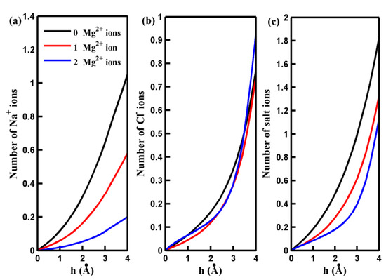 The number of the Na+ ions (a), Cl− ions (b), and salt ions (c) accumulating in a cylindrical region below and around the centers of the pores with different numbers of adsorbed Mg2+ ions as a function of the height of the cylinder h.