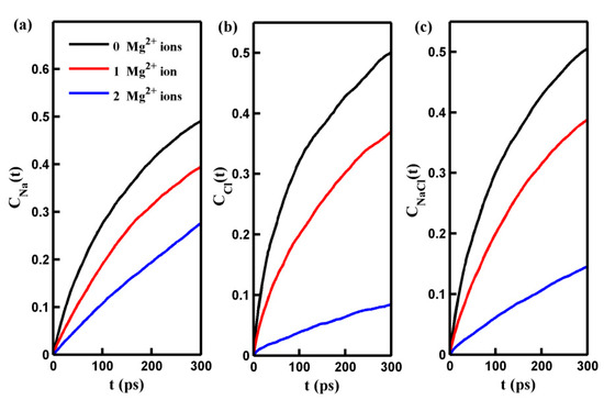 The permeation time autocorrelation function of Na+ ion (CNa(t)) (a), Cl− ion (CCl(t)) (b), and salt ion (CNaCl(t)) (c) in pores with different numbers of adsorbed Mg2+ ions as a function of time t.