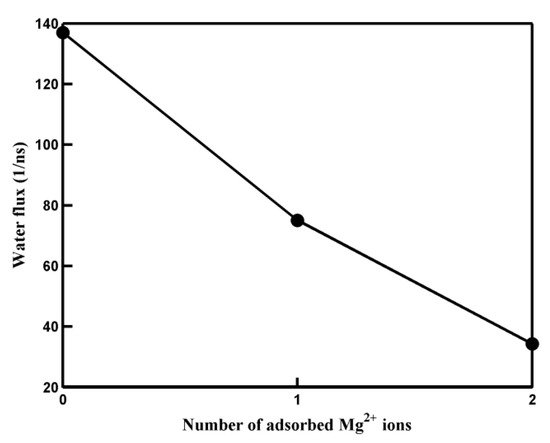 Like the salt rejection rate, water flux is another crucial factor in water desalination using membrane materials. The water flux was measured by counting the net number of water molecules passing through the pore during the course of the simulation time [41]. Figure 5 illustrates the results for water flux as a function of the number of adsorbed Mg2+ cations. It is observed that the water flux decreases as the number of adsorbed Mg2+ cations increases. Nevertheless, as indicated in Table 2, even in the case of a pore with two adsorbed Mg2+ cations, its water permeability still reaches an impressive value of 58.7 L/cm2/day/MPa. This level of water permeability significantly surpasses that of many other nanopores, including MoS2 nanopores, hydrogenated graphene nanopores, phosphorene, and g-C3N4 nanopores. Furthermore, the salt rejection of the pore with two adsorbed Mg2+ cations meets the requirements for desalination purposes. As explained in Supplementary Materials Section S2, the variation in water flux is attributed to the fact that the adsorption of Mg2+ ions on the pore’s rim can influence the permeation probability of water molecules passing through the pore.
