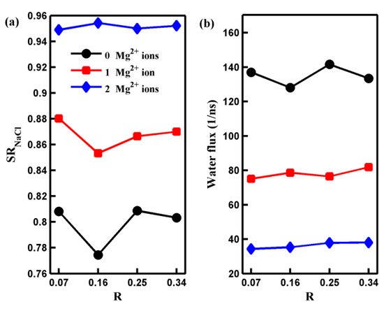In the case of the pore without an Mg2+ cation, the salt rejection rate and water flux exhibited peaks and troughs at R = 0.25 and R = 0.16, respectively, as shown in Figure 6. The result displayed in Figure 7a reveals that the number of salt ions inside the pore without an Mg2+ cation changes significantly but not monotonically with the oxidization degree. In the case of R = 0.25 (R = 0.16), although the permeation probability of salt ions is the highest (the second smallest) among the four cases, the number of ions inside the pore is the smallest (largest). Thus, the substantial difference in the number of ions inside the pore between R = 0.25 and R = 0.16 leads to an extensive range of variation in the salt rejection rate without adsorbed Mg2+ cations. As demonstrated in Figure 7b, the distribution of water inside the pore is nearly the smallest (the largest) among all the systems when R = 0.16 (R = 0.25). These results suggest the presence of competitive penetration between salt ions and water molecules [32]. Although the number of water molecules in the pore is not greatly affected by changes in the oxidization degree, the water flux of the pore without adsorbed Mg2+ cations exhibits a significant change with the oxidization degree. This is mainly because the variation trend of the permeation probability of water with respect to the oxidization degree is similar to the variation trend of the number of water molecules inside the pore as the oxidization degree changes. Therefore, both the permeation time of water molecules and the number of water molecules within the pore play crucial roles in water desalination. However, the situation is somewhat different when considering the salt rejection rate of the pore with adsorbed Mg2+ cations. The salt rejection rate of the pore with adsorbed cations is primarily influenced by two significant factors: the number of salt ions inside the pore and the permeation time of the salt ions. However, since the oxidization degree of the GO membrane has minimal impact on the number of salt ions inside the pore and the permeation probability of ions, the salt rejection rate of the pore with adsorbed Mg2+ cations fluctuates within a narrow range. On the other hand, the water flux of the pore with adsorbed Mg2+ cations is co-determined by the permeation time of water molecules across the pore and the number of water molecules inside the pore, similar to the case of the pore without adsorbed Mg2+ cations. However, due to the pronounced difference between the change in the number of water molecules inside the pore and the permeation probability of water molecules with respect to the oxidization degree, the small variations in either the number of water molecules inside the pore or the permeation probability of water molecules alone cannot result in a significant change in the water flux.