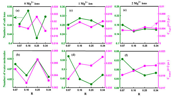 (a–f) show the number of the salt ions (water molecules) located inside the pore and the salt ion (water molecule) permeation time autocorrelation function at time t = 2 ps for each oxidization degree R. The figures along the parallel direction represent the pores with 0, 1, and 2 adsorbed Mg2+ ions. The solid lines are a guide to the eye.