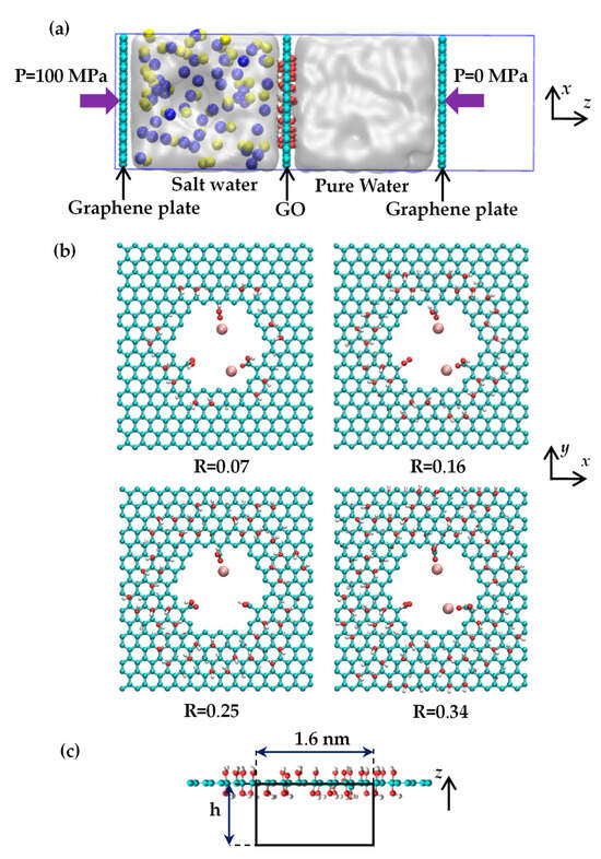 Given that GO layers predominantly consist of hydroxyl groups [30,44], the GO membrane utilized in our study features hydroxyl groups on both sides of the graphene basal plane. Figure 8b shows the placement of a single nanopore at the center of the GO membrane. The pore diameter, calculated using the formula , measures 1.29 nm [10]. This pore size is sufficiently large to facilitate the transport of salt ions from saltwater to pure water and can be readily created experimentally [27]. Three carboxyl groups are also attached to the carbon atoms on the pore’s edge. As oxidized regions tend to form a continuous network across the GO membrane and consistently coexist with nanopores in the same area, the hydroxyl groups are distributed in a circular region surrounding the pore [32]. The oxidation degree of the GO membrane is characterized by the R = noh/nc ratio, which ranges from 7% to 34%, where noh represents the number of hydroxyl groups and nc denotes the number of carbon atoms. Figure 8b provides top views of the GO membranes. The figure illustrates that the Mg2+ ions were initially positioned near the carboxylic oxygen (double-bonded) sites. Due to the strong electrostatic interaction between Mg2+ ions and carboxylic oxygen, the Mg2+ ions consistently remain near the carboxylic oxygen throughout all MD simulations (for further details, please refer to Supplementary Materials Section S1). Figure 8b shows that the number of Mg2+ ions adsorbed to the carboxyl groups varies between 1 and 2. Except the counter ions of Na+, there are another 2 or 4 Cl− ions that should be added to maintain the electroneutrality of the system with Mg2+ ions.