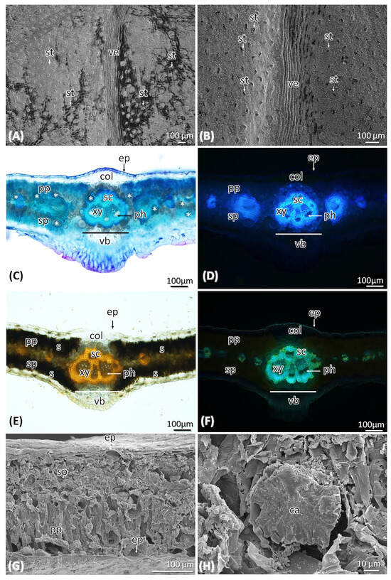 Surface view and transverse section of leaf of A. pyrifolia. (A,B). Ultra-structural surface view of leaf using Scanning Electron Microscopy (SEM). (A). Leaf upper surface, (B). Leaf lower surface, both showing the presence of stomata (st). (C). Leaf section observed under visible light, stained with Toluidine blue O. Calcium oxalate crystals marked with (*). (D). observed under UV, auto- fluorescence of lignified cells in the leaf. (E). Presence of starch grains in the palisade parenchyma cells of the leaf, stained with Lugol’s iodine. (F). Stained for cutin and lignin with Auramine O. (G). Transverse section of leaf showing the internal structure, observed under SEM. (H). Close view of calcium oxalate crystal present in the leaf. ep—epidermis, col—collenchyma cells, pp—palisade parenchyma cells, sc—sclerenchyma cells, xy—xylem, ph—phloem, sp—spongy parenchyma cells, vb—vascular bundles, ve—vein, s—starch grains, st—stomata, ca—calcium oxalate crystals.