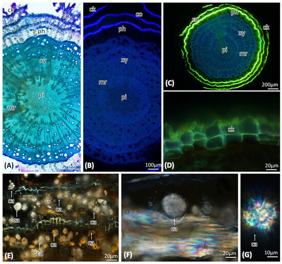 Transverse section of stem. (A). Toluidine Blue O stained section viewed under visible light. (B). Same was observed under UV. (C,D). Stained with Fluorol Yellow 088, it shows the strong UV active cork-cortex cells. (E–G). presence of calcium oxalate crystals, visible clearly under polarized light. ck—cork, co—cortex, ph—phloem, xy—xylem, mr—medullary rays, pi—pith, ca—calcium oxalate crystals.