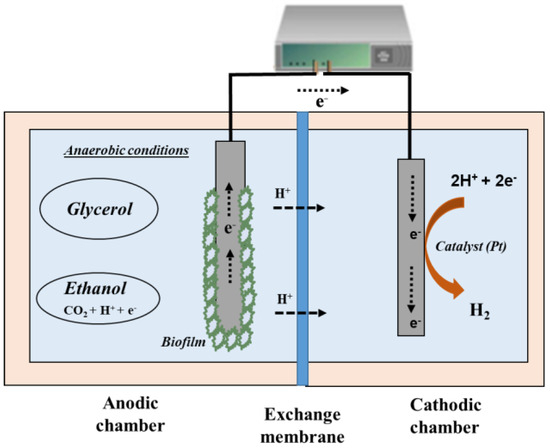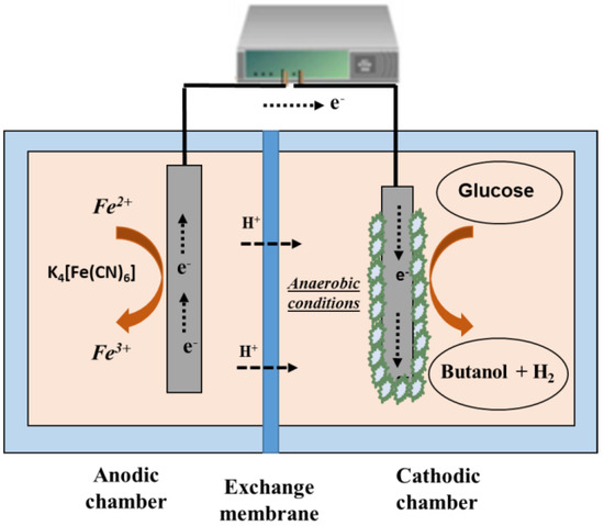 A typical EF system is formed by an anodic chamber and a cathodic chamber electrically connected through an external circuit. This electrochemical configuration can be operated in two modes, (i) anodic EF and (ii) cathodic EF. The anodic EF mode refers to a system in which the final product is more oxidized than the substrate. This applies, for example, to the case of the obtention of ethanol using glycerol as a substrate. The working electrode of the cell is the anode, which allows for the dissipation of electron excess (electron sink). On its part, cathodic EF implies the formation of a reduced final product. The working electrode is now the cathode, which provides electrons (electron source). The generation of butanol from glucose is an example of cathodic EF. One of the differences between EF systems and other bioelectrochemical systems such as MECs is that the amount of current density to be provided to the system is lower to cause a significant effect on the process [13].