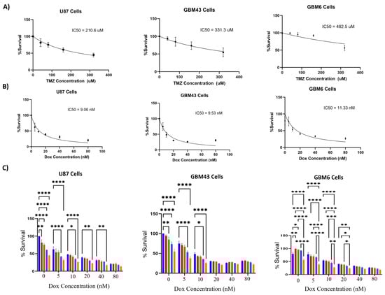 Effect of combination treatment with temozolomide and doxorubicin. (A) Temozolomide, (B) doxorubicin, and (C) combination treatment with temozolomide and doxorubicin in U87, GBM43, and GBM6 cells. The percentage survival for the combination treatment with temozolomide and doxorubicin was compared with the treatment with its single components. p values (* <0.05, ** <0.01, *** <0.001, **** <0.0001).