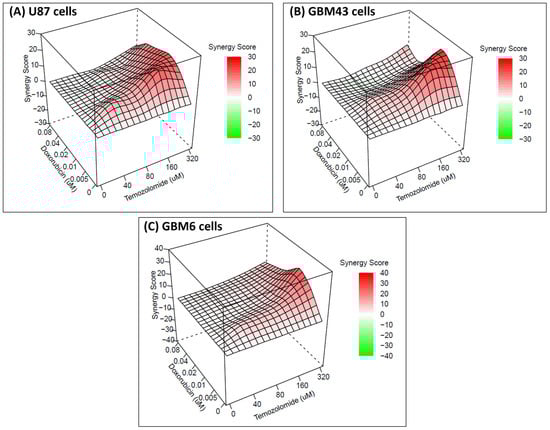 The 3D images showing synergy between the combination of drugs (temozolomide and doxorubicin) based on HSA score for different cell lines. (A) U87 cells, (B) GBM43 cells, and (C) GBM6 cells. The graph was generated using synergy finder, an online-based tool to determine synergy. Red color—synergistic, green color—antagonistic.