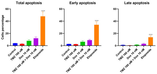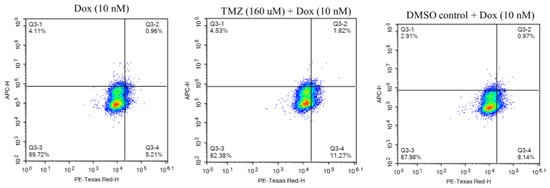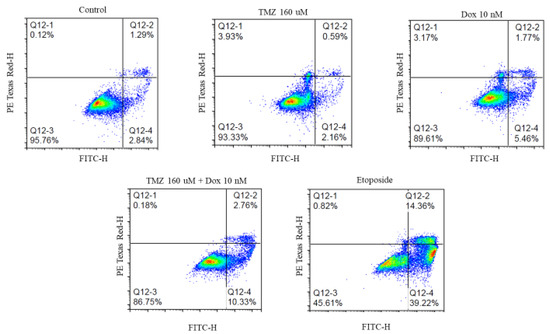 The effect of the combination treatment of temozolomide and doxorubicin on apoptosis was tested using an AlexaFluor 488 annexin V/Dead cell apoptosis kit. The GBM43 (300,000) cells were plated on a 6-well plate. After 24 h of plating, the cells were treated with temozolomide (160 uM), doxorubicin (10 nM), and the combination of temozolomide (160 uM) and doxorubicin (10 nM). The DMSO-treated and untreated cells were used as negative controls. The cells treated with etoposide (500 uM) were considered as the positive control. After 24 h of treatment, the cells were trypsinized and collected. The cells were then stained with annexin V and PI to determine the apoptotic and dead cells. Annexin V binds to the phospholipids exposed outside that are present in apoptotic cells. The PI can enter through the plasma membrane of the dead cells and stain the nucleic acid, thereby representing dead cells. The cells stained by annexin V and PI were analyzed by using flow cytometry (Novocyte by ACEA Biosciences, Inc., San Diego, CA, USA) to determine the percentages of early and late apoptotic cells.