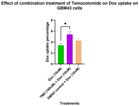 Effect of combination treatment of temozolomide and doxorubicin on doxorubicin uptake in GBM43 cells. The cells were treated with doxorubicin (10 nM) or combination treatment of temozolomide (160 uM) and doxorubicin (10 nM). Cells treated with DMSO and doxorubicin were used as solvent control for DMSO. The untreated cells were used for subtraction of autofluorescence from these treatment groups. The cells were stained with live/dead fixable Far Red Dead Cell Stain Kit to stain dead cells that could be detected on the APC channel. Doxorubicin has its own fluorescence and can be detected in the PE Texas Red channel. The percentage of cells detected on the PE Texas Red channel but not on the APC channel were considered to be positive for doxorubicin uptake. TMZ alone was not shown in the dox uptake experiment, as it does not generate any signal due to its non-fluorescent nature. The bar graph represents positive-cell percentages for doxorubicin uptake for each treatment group after subtraction of autofluorescence from untreated cells. p value (* <0.05).