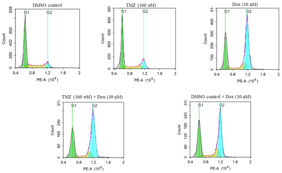 The cell cycle analysis showed higher cell cycle arrest at the G1 phase for control (DMSO-treated) groups and cells treated with temozolomide only (Figure 7). However, the cells treated with doxorubicin, the combination treatment of temozolomide and doxorubicin, and the combination treatment of DMSO and doxorubicin showed higher cell cycle arrests at the G2 phase. The cell cycle arrests (indicated by percentage of cells at the G1, S, and G2 phases) were significantly different in cells treated with doxorubicin, the combination treatment of temozolomide and doxorubicin, and combination treatment of DMSO and doxorubicin compared to the control and the cells treated with temozolomide only (Figure 8). However, there was no significant difference in cell cycle arrest in any of the cells treated with doxorubicin (doxorubicin, combination treatment of temozolomide and doxorubicin, and combination treatment of DMSO and doxorubicin), suggesting the role of doxorubicin for arrest at the G2 phase. Similarly, there was no significant difference in cell cycle arrest for the control groups and cells treated with temozolomide only.