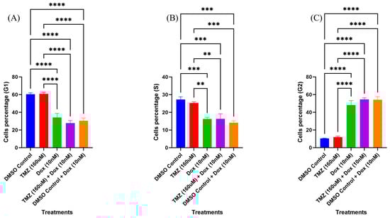 Effect of combination treatment of temozolomide and doxorubicin on cell cycle. (A) Cell cycle arrest for different treatment groups at the G1 phase, (B) cell cycle arrest for different treatment groups at the S phase, (C) cell cycle arrest for different treatment groups at the G2 phase. **** (p value < 0.0001), *** (p value < 0.001), ** (p value < 0.01).