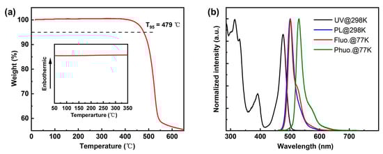 (a) TGA and DSC (inset) diagrams of BNBO; (b) ultraviolet–visible (UV–vis) absorption/photoluminescence (PL) spectra at room temperature (298 K) and fluorescence/phosphorescence spectra at low temperature (77 K) of BNBO measured in toluene solutions (10−5 M).