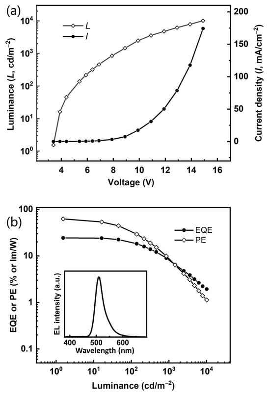 (a) J–V–L characteristics and (b) EQE-PE–L characteristics of device (inset: EL spectra of device at a luminance of 100 cd/m−2 and a current density of 0.35 mA/cm−2 under an applied voltage of 5.2 V).