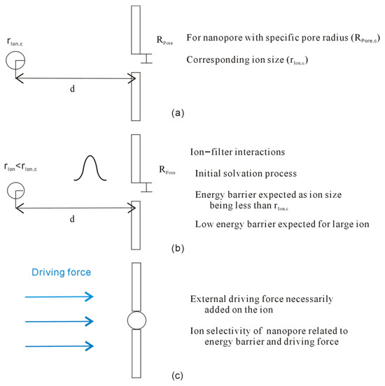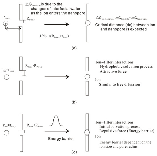 Additionally, as the radius of the nanopore is less than RPore,c (RPore < RPore,c and rIon = rIon,c), it is related to the initial solvation process. In the initial solvation process, the “repulsive” force between solutes is expected as they pushed together in water. In other words, as the ion approaches the nanopore, the energy barrier may be expected between the ion and the filter (Figure 3).