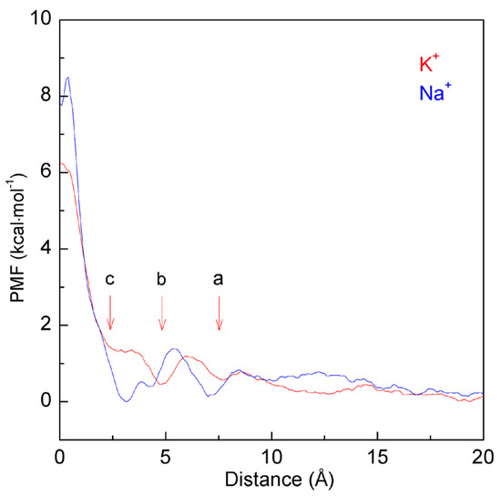 The PMFs as K+ and Na+ permeate the nanopore with a radius of 3.7 Å. During K+ approaches the nanopore, various minima are found at 7.5 Å, 4.7 Å, and 2.4 Å, which are labeled as a, b, and c. Compared with Na+, a lower energy barrier is found as K+ enters the nanopore. Due to the difference in energy barrier, this leads to the ion selectivity for K+ over Na+.