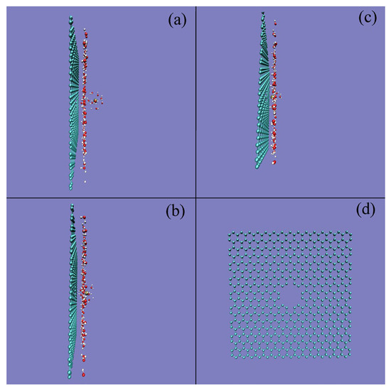 Snapshots of water molecules between K+ and the nanopore at various distances shown in Figure 5: (a) 7.5 Å, (b) 4.7 Å, and (c) 2.4 Å. (d) The nanopore with a pore radius of 3.7 Å is also shown.