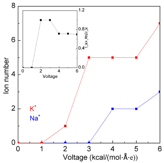 In this study, a few MD simulations were conducted to investigate the effects of electrical voltage on ion selectivity (Supplementary Materials). In the simulations, various electrical voltages were added to the aqueous solution, which was composed of 10 KCl and 10 NaCl molecules. It is necessary to provide enough voltage (2.0 kcal·mol−1·Å−1·e−1) so that the K+ ions may firstly pass through the filter with a pore radius of 3.7 Å (Figure 9). With increasing voltage, more K+ ions may pass through the filter. However, some Na+ ions were found to penetrate the nanopore at high voltages. As the voltage is 3.0 kcal·mol−1·Å−1·e−1, the filter gave the suitable ion selectivity of K+/(K+ + Na+) (Figure 9). Regarding the specific ion, it is important to design the corresponding nanopore for the ion. Additionally, it is also necessary to choose the reasonable voltage to drive the specific ion to pass through the corresponding nanopore of the filter.