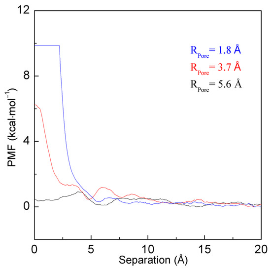 In addition, the energy barrier between the ion and nanopore may be affected by not only the ion size but also the pore radius of the nanopore (RPore < RPore,c and rIon = rIon,c). In this study, to investigate the dependence of ion selectivity on the radius of the nanopore, MD simulations were also conducted on the systems in which the K+ ion approaches the nanopore with different radii, namely 1.8 Å, 3.7 Å, and 5.6 Å. From the calculated PMFs (Figure 10), the energy barrier can be found as the K+ ion enters the nanopore with the different radii. However, with an increase in the radius of the nanopore, this decreases the energy barrier between the K+ ion and nanopore. This is in agreement with the above discussion on the effects of pore radius on the energy barrier.