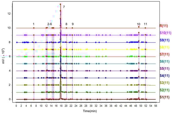 Chromatography fingerprint of 10 batches of PC extract.
