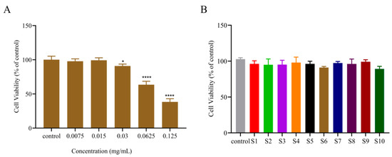 Cytotoxicity of PC extract on B16-F10 cells. (A) The effects of PC extract (S6) on B16-F10 cell viability after treatment with different concentrations. (B) 10 batches of PC extract from different sources on B16-F10 cell viability after treatment with 0.03 mg/mL concentration. (Compared with control, * p < 0.05, **** p < 0.0001.)