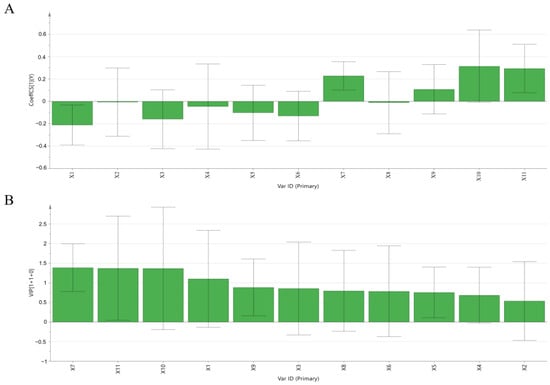 The established regression equation was Y = 5.8961 − 0.2119X1 − 0.0073X2 − 0.1595X3 − 0.0464X4 − 0.1022X5 − 0.1308X6 + 0.2285X7 − 0.0116X8 + 0.1082X9 + 0.3142X10 + 0.2939X11, and the model diagnostic parameters R2X = 0.585, R2Y = 0.911, Q2 = 0.742, indicating that the regression model had strong fitting explanatory power and model predictive power. As shown in Figure 4A, the positive regression coefficients for peaks 7, 9, 10 and 11 indicated that these peaks are positively correlated with activity.