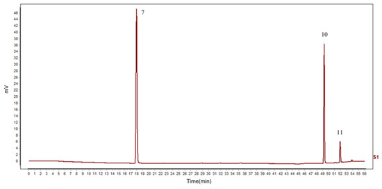 Chromatographic separation was performed on an Agilent 1200 HPLC system with a ZORBAX Eclipse XDB-C18 column (4.6 mm × 250 mm, 5 μm) (Thermo Scientific TM, Waltham, MA, USA). The mobile phase was a mixture of acetonitrile (A) and 0.2% phosphoric acid water (B). The injection volume was 10 μL, and the flow rate was 1.0 mL/min. The detection wavelength and column temperature were set at 290 nm and 40 °C, respectively. The optimized gradient elution steps were: 0–10 min: 10–24% A, 10–12 min: 24–25% A, 12–15 min: 25–28% A, 15–25 min: 28–30% A, 25–35 min: 30–31% A, 35–40 min: 31–35% A, 40–50 min: 35–90% A, and 50–60 min: 90–100% A. All sample solutions were filtered with the 0.45 μm microporous membrane before injection.