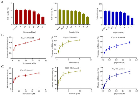 As shown in Figure 6B, TYR inhibition rates of resveratrol, emodin and physcion increased with increasing concentration, and the IC50 values of TYR inhibition rate by the three components were 7.83 μM, 17.51 μM, and 16.52 μM, respectively. These data suggested that the three components all had a certain TYR inhibitory effect. Melanin inhibition results of resveratrol, emodin and physcion were shown in Figure 6C. The IC50 values of melanin content were 13.5 μM, 15.80 μM, and 19.09 μM, respectively. These data indicated that all three predictive components were effective in inhibiting melanin production and had a certain whitening potential.