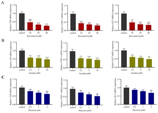 Effects of three components (resveratrol, emodin and physcion) on the expression of melanogenesis-related factors in B16F10 cells. The relative quantification of mRNA expression in B16F10 cells was performed by qRT-PCR. (A) Relative TYR, TYRP-1, DCT mRNA expression after resveratrol treatment. (B) Relative TYR, TYRP-1, DCT mRNA expression after emodin treatment. (C) Relative TYR, TYRP-1, DCT mRNA expression after physcion treatment. (Data are expressed as the means ± SD of three independent experiments. * p < 0.05, ** p < 0.01, *** p < 0.001 and **** p < 0.0001 compared with the control using the one-way ANOVA comparison test.)