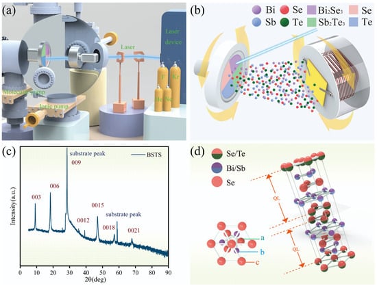 (a) Schematic diagram of Laser Molecular Beam Epitaxy (LMBE) equipment preparation. (b) Schematic diagram of mixed-target assembly. (c) XRD diffraction pattern of the BSTS sample. (d) Schematic illustration of the molecular structure of the BSTS sample.