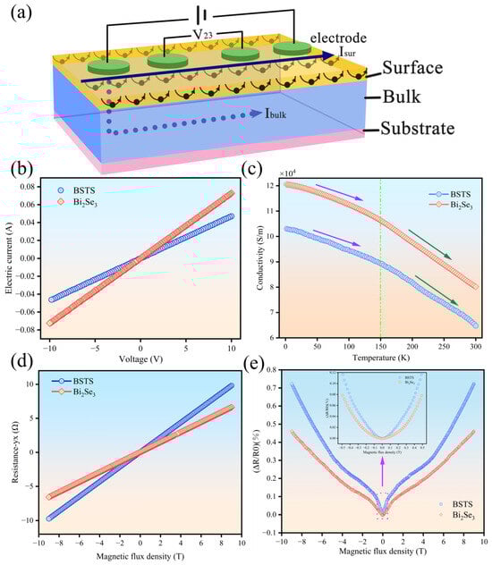 (a) Schematic illustration of the dual-channel, bulk-surface transport in the BSTS and Bi2Se3 sample and the principle of PPMS measurement. (b) Current–voltage (I-V) relationship of the BSTS and Bi2Se3 sample at room temperature. (c) Relationship between bulk conductivity and temperature in the BSTS and Bi2Se3 sample. (d) Relationship between Hall resistance and magnetic field variation in the BSTS and Bi2Se3 sample. (e) Magnetoresistance variation of the BSTS and Bi2Se3 sample with magnetic field changes in the range of −9T to 9T at 2K temperature.
